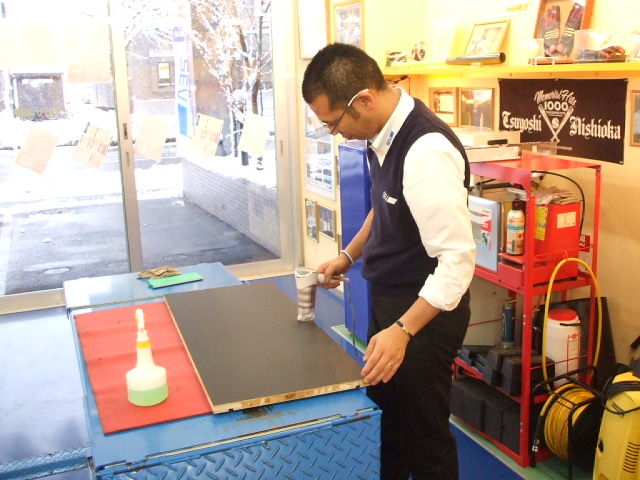 脱脂をしっかり行い、カーボンシートを貼っていきます
