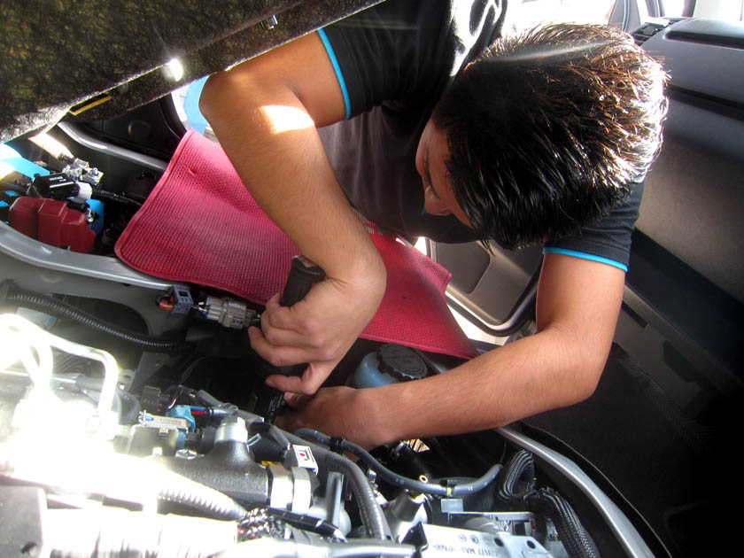 各自動車用SEVをスタッフ村松がお客様の好みに合わせてセットアップ中。