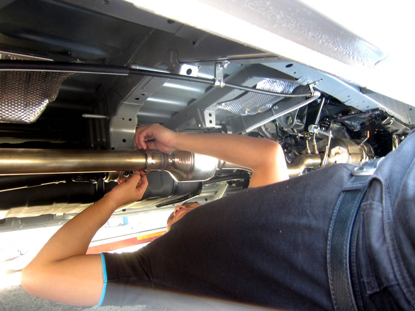 下回りの施工中。新車なのでピカピカですね〜。